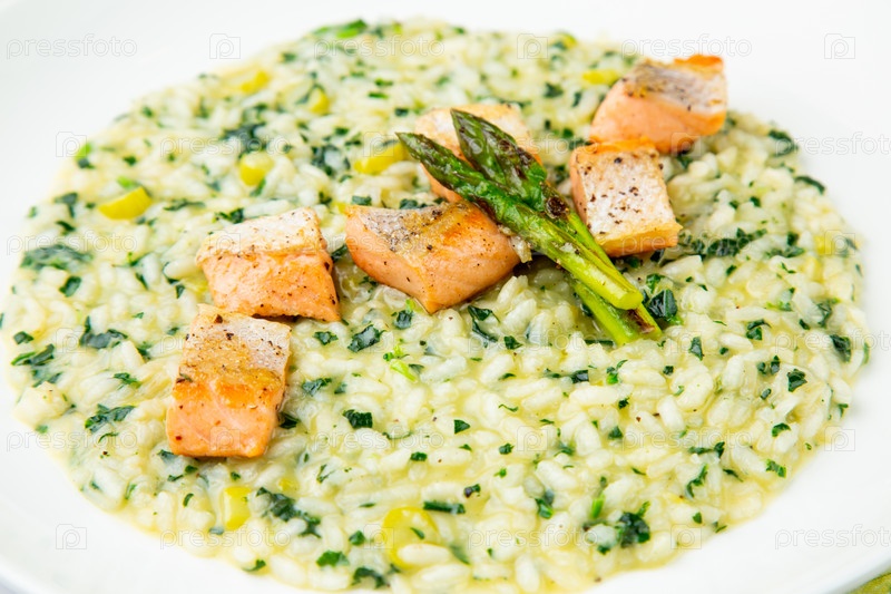 Рисовая каша с артишоками, красной рыбой и зеленью в белой тарелке, вид сбоку