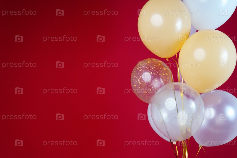 Светлые шары - белые, бежевые, прозрачные, перламутровые на красном фоне. Горизонтальное фото. Место для текста