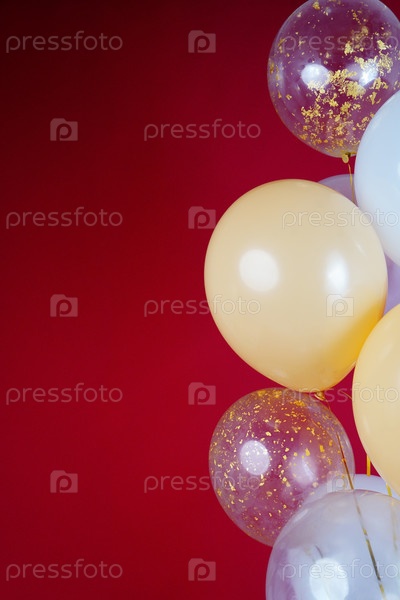 Вертикальное фото белых и прозрачных воздушных шаров на красном бордовом фоне. Место для текста