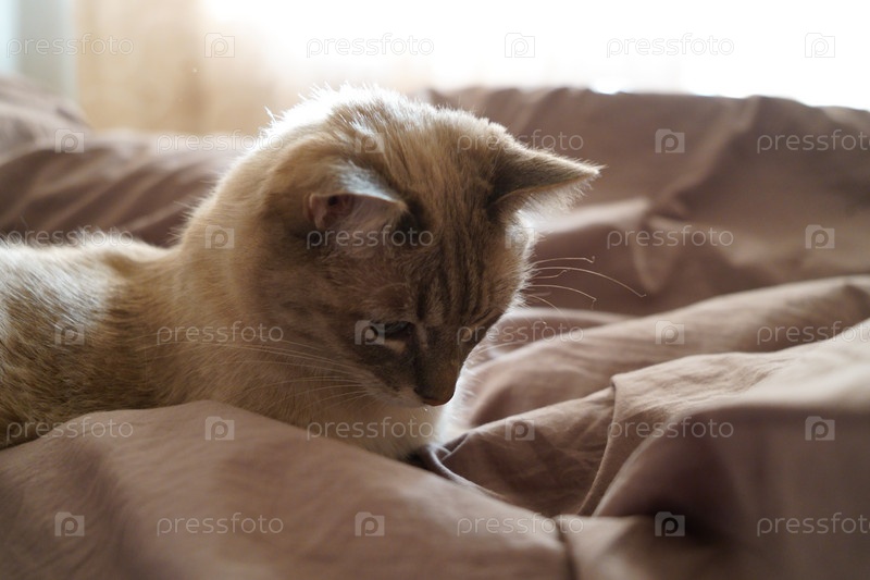 Вид спереди милой красивой кошки сиамской породы на классическом коричневом одеяле