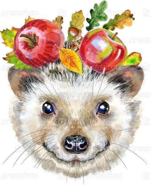 Акварельный портрет ежа с яблоками и листьями