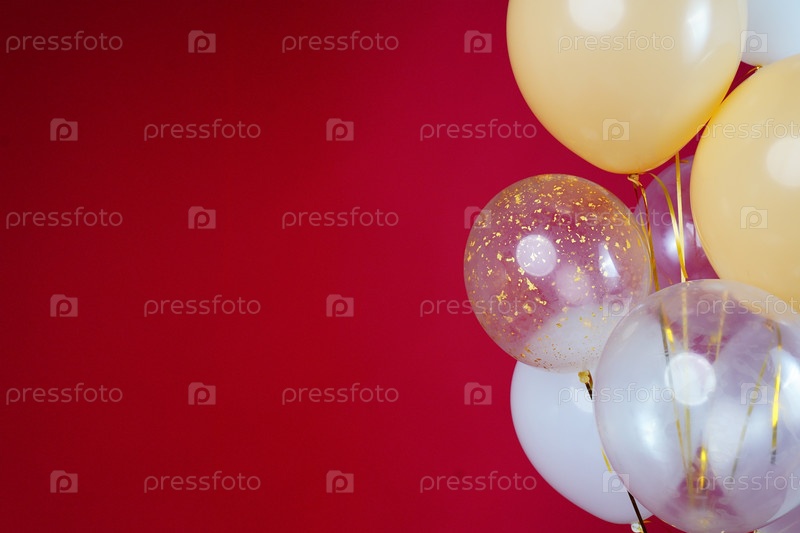 Светлые шары - белые, бежевые, прозрачные, перламутровые на красном фоне. Горизонтальное фото. Место для текста