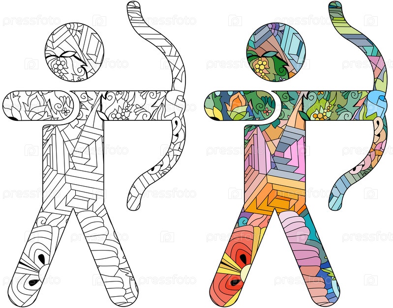 Ручная роспись художественного дизайна. Ручной рисунок Иконка Стрельба из лука для раскраски, футболки и других украшений. Набор цветов и контуров