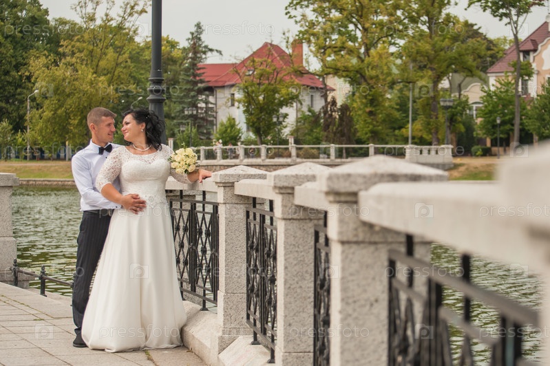 Молодожены, жених и невеста на свадьбе возле пруда