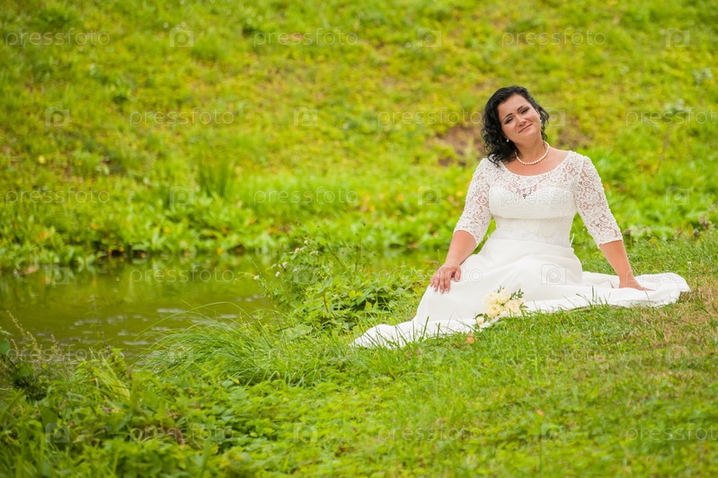 Молодая невеста позирует сидя на лужайке