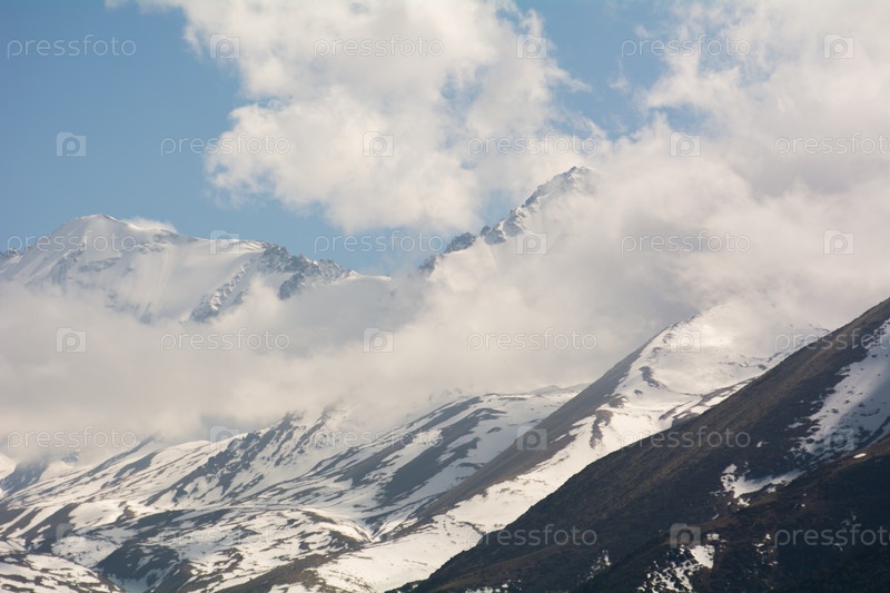 Снежные горные вершины среди облаков, Киргизский хребет, урочище Чонкурчак, страна Кыргызстан. Селективный фокус