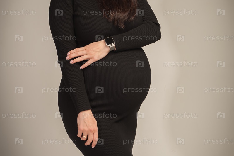 Беременная женщина с большим животом позирует в фотостудии