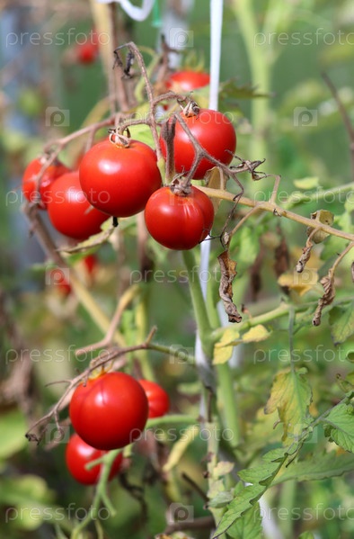 Куст с созревшими плодами томатов в теплице - крупный план