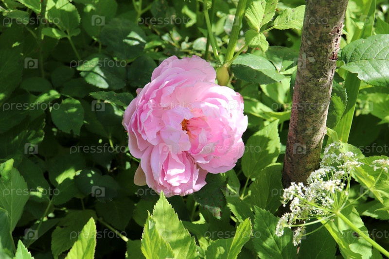 Розовая пионовидная роза на кусте в саду - крупный план