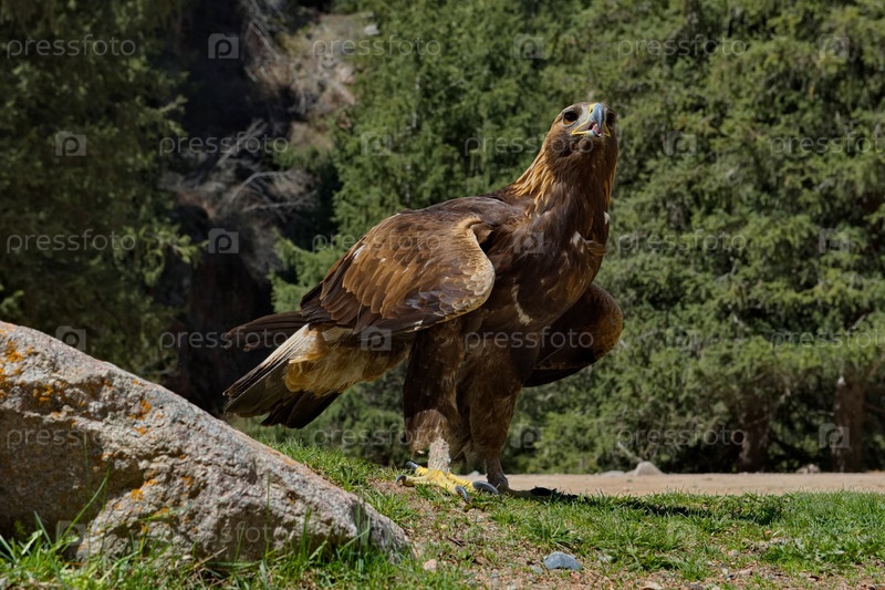 Киргизия. Портрет сидящего на таежных скалах Беркута в одном из многочисленных горных ущелий озера Иссык-Куль