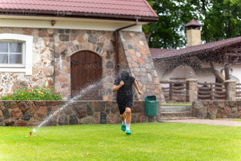Молодой белый мальчик бежит под водой из разбрызгивателя