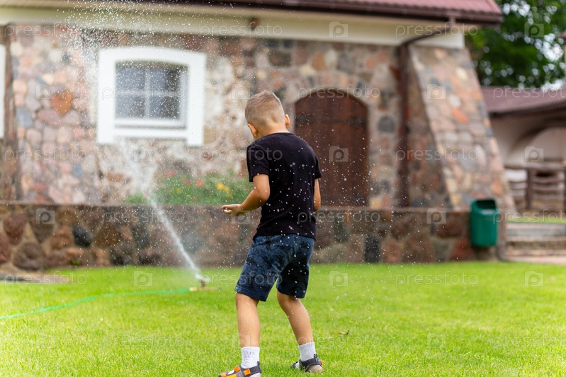 Молодой белый мальчик бежит под водой из разбрызгивателя