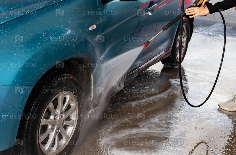 Ручная автомойка водой под давлением на автомойке снаружи. Летняя мойка автомобилей. Очистка автомобиля водой под высоким давлением. Мытье с мылом. Концепция крупным планом