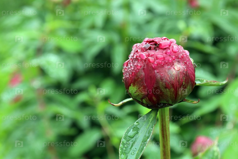 Красный бутон пиона с каплями воды после дождя