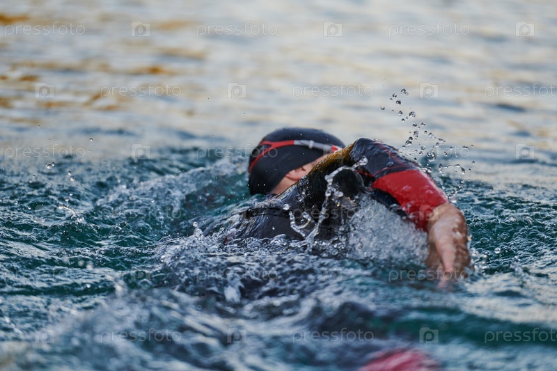 Спортсмен по триатлону плавает на озере на рассвете в гидрокостюме