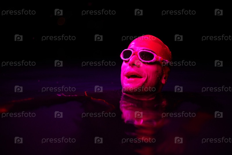Настоящий пловец-триатлет, отдыхающий во время тяжелых тренировок при ночном неоновом гелевом свете