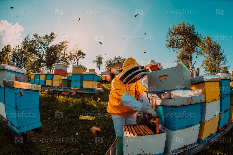 Пчеловоды проверяют мед на рамке улья в поле. Владельцы малого бизнеса на пасеке. Производитель натуральных здоровых продуктов питания работает с пчелами и ульями на пасеке