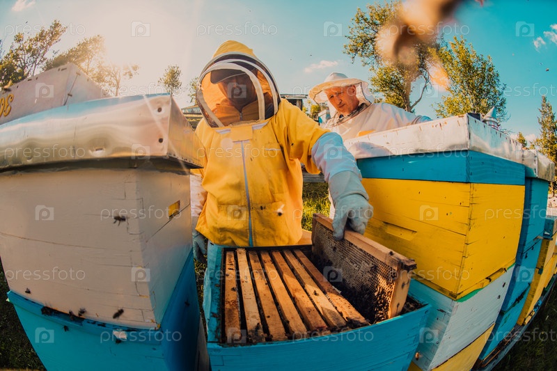 Пчеловоды проверяют мед на рамке улья в поле. Владельцы малого бизнеса на пасеке. Производитель натуральных здоровых продуктов питания работает с пчелами и ульями на пасеке
