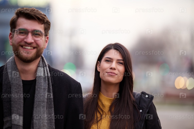 Романтическая пара нежно обнимается, прогуливаясь по улицам города, наслаждаясь вместе досугом в компании друг друга