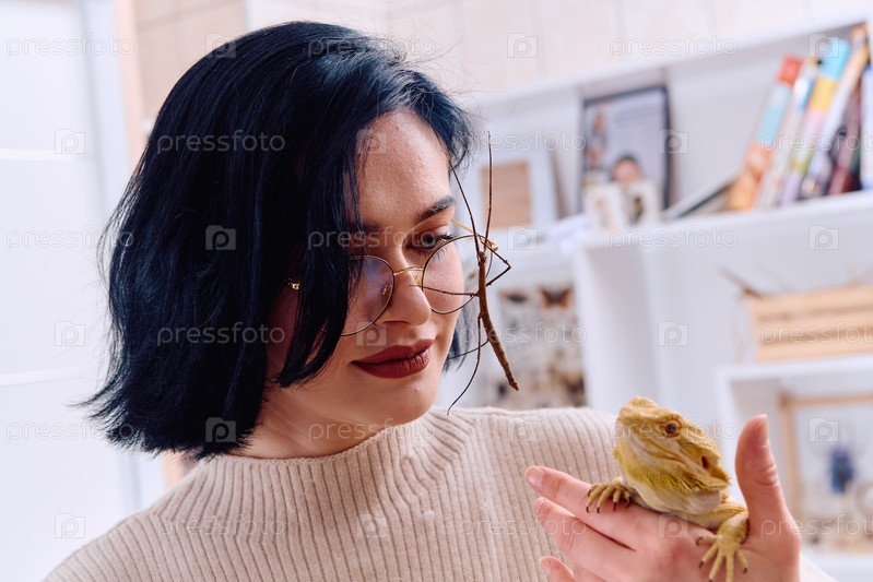 Девушка и ее питомцы: бородатый дракон и палочник