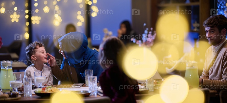 В современном ресторане исламская пара и их дети с радостью ждут ифтара во время священного месяца Рамадан, олицетворяя семейную гармонию и культурный праздник в современной обеденной атмосфере
