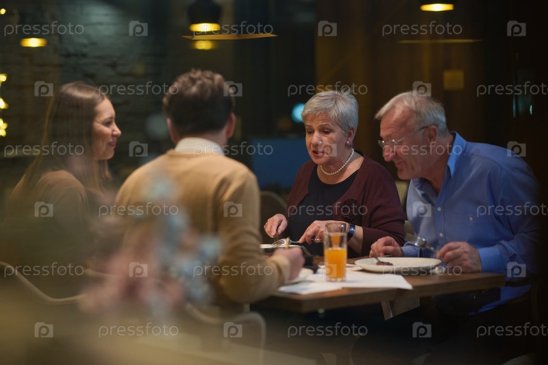 Современная и традиционная европейская исламская семья собирается вместе на ифтар в современном ресторане во время поста Рамадан, олицетворяя культурную гармонию и семейное единство среди кулинарного праздника разнообразия