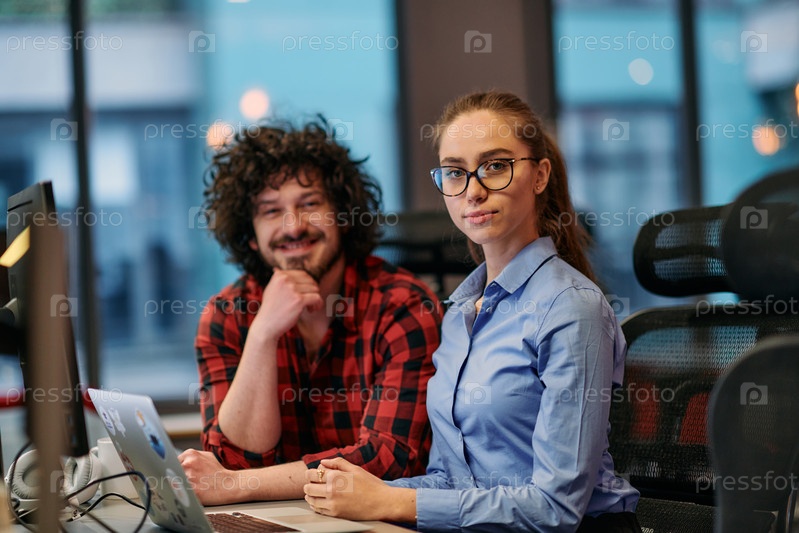 Молодая европейская бизнес-команда сотрудничает за компьютером в современном офисе