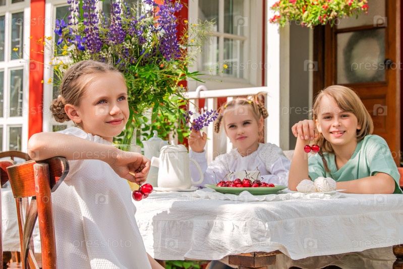 Трое детей едят вишню за столом с белой скатертью и вазой с цветами в саду загородного дома. Сцена веселая и игривая