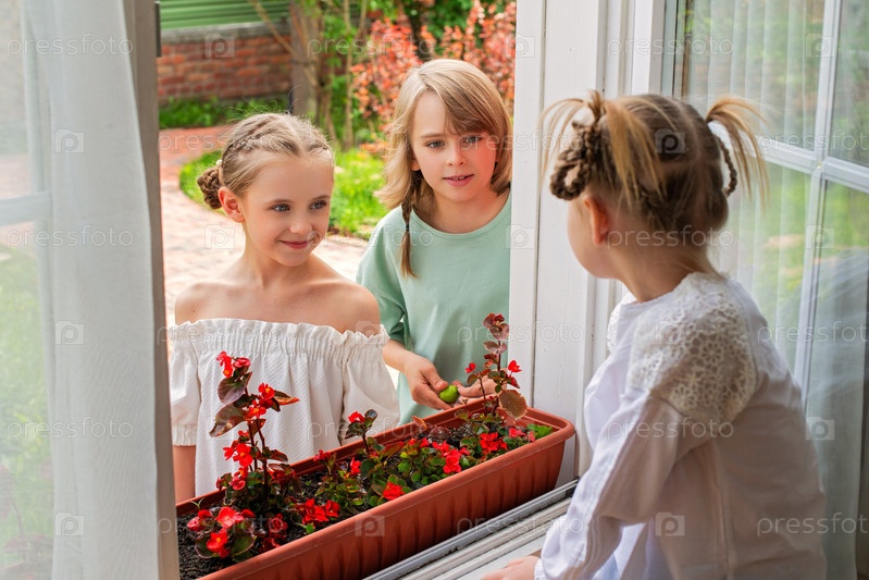 Дети общаются через открытое окно загородного дома. Подоконник украшен коробочкой с красными цветами