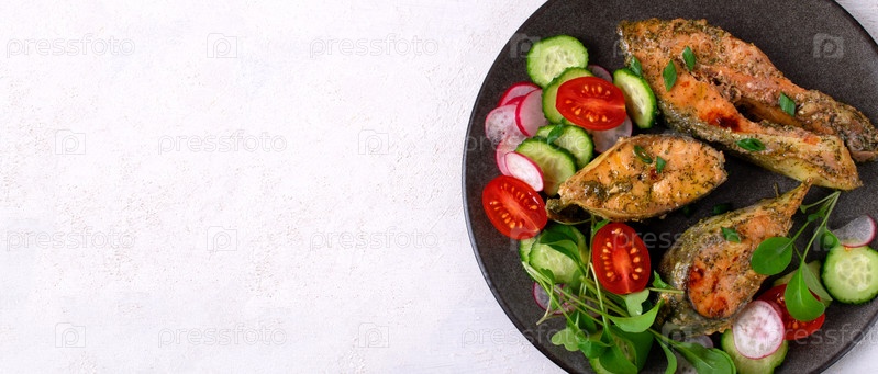 Запеченные в духовке стейки горбуши с овощным салатом на темной тарелке на белом столе. Здоровая еда. Макет с копировальным пространством