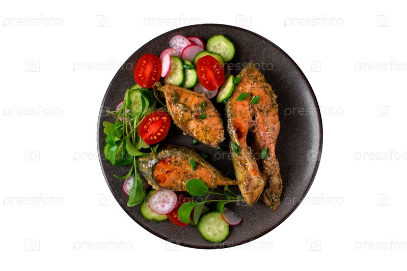 Запеченные в духовке стейки горбуши с овощным салатом на темной тарелке, изолированной на белом