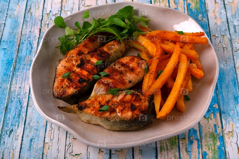 Жареные стейки горбуши с картофелем фри и рукколой подаются на тарелке на синем столе