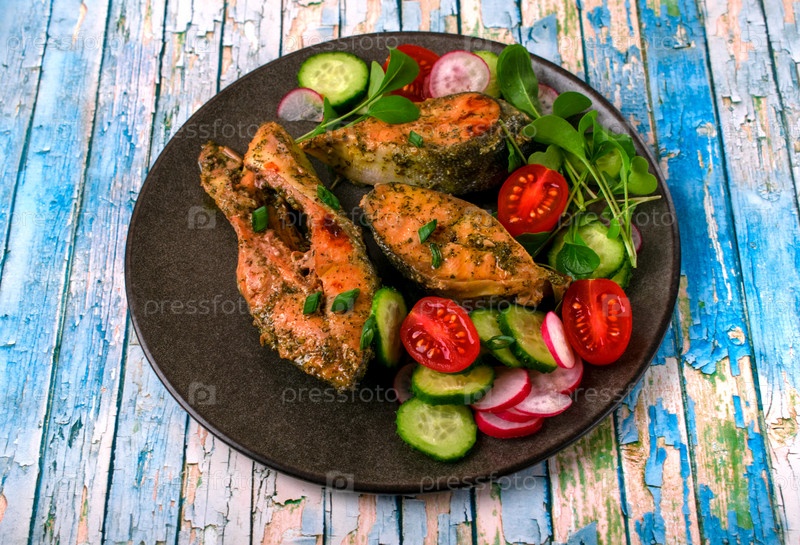 Запеченные в духовке стейки горбуши с овощным салатом на темной тарелке на синем столе. Здоровая еда