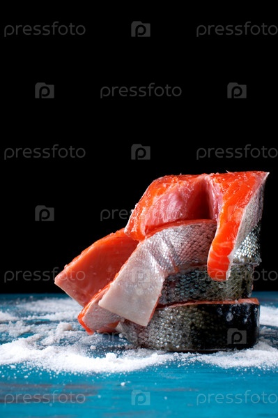 Стейки из сырой форели на соли на черном фоне. Свежий ингредиент морепродуктов. Приготовление красной рыбы. Макет с копировальным пространством