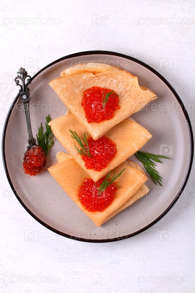 Блинчики на закваске с красной икрой подаются на тарелке на белом столе. Русская еда. Вид сверху