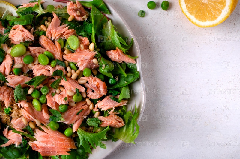 Салат с копченой форелью, фасолью эдамаме, киноа, зеленым горошком и шпинатом, листьями мангольда и кукурузы подается на белой тарелке с местом для копирования на столе. Вид сверху