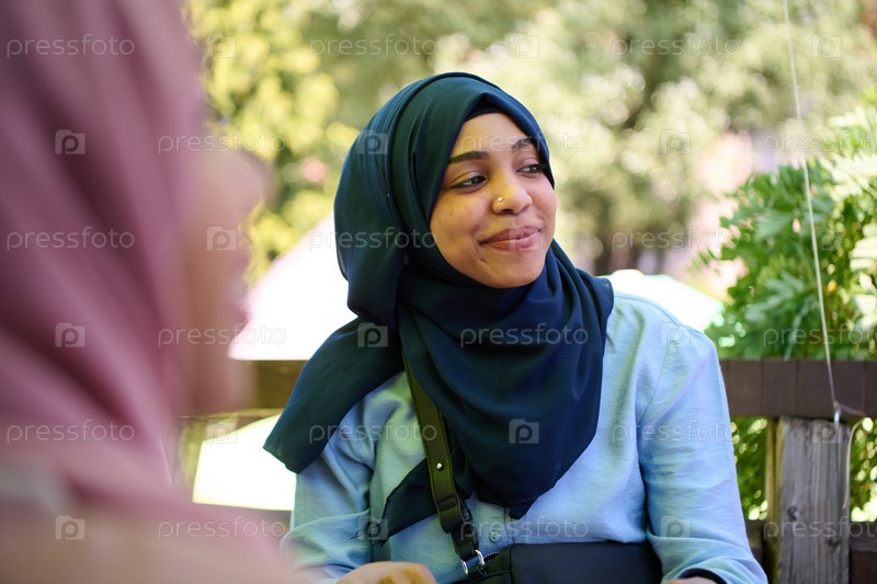 Ближневосточная мусульманка наслаждается кофе и беседует с другом на природе