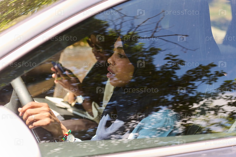 Две мусульманки в хиджабах разговаривают по смартфону, путешествуя вместе в машине по