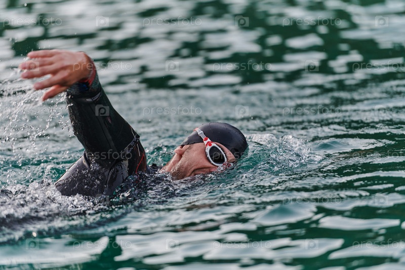Профессиональный триатлонист с непоколебимой преданностью тренируется перед предстоящими соревнованиями на озере, излучая чувство атлетизма и глубокое стремление к совершенству