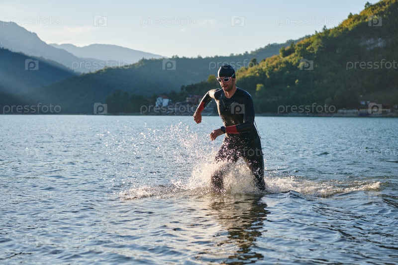 Спортсмен по триатлону начинает тренировку по плаванию на озере