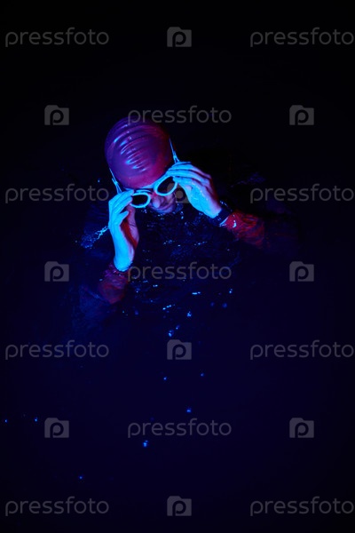 Настоящий пловец-триатлет, отдыхающий во время тяжелых тренировок при ночном неоновом гелевом свете