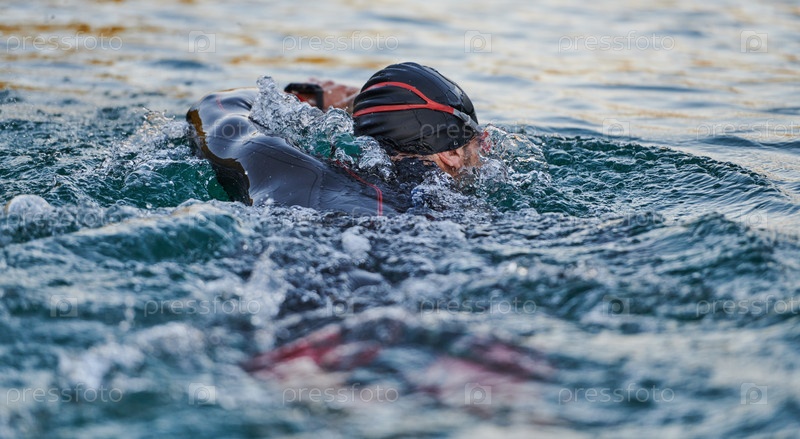 Спортсмен по триатлону плавает на озере на рассвете в гидрокостюме