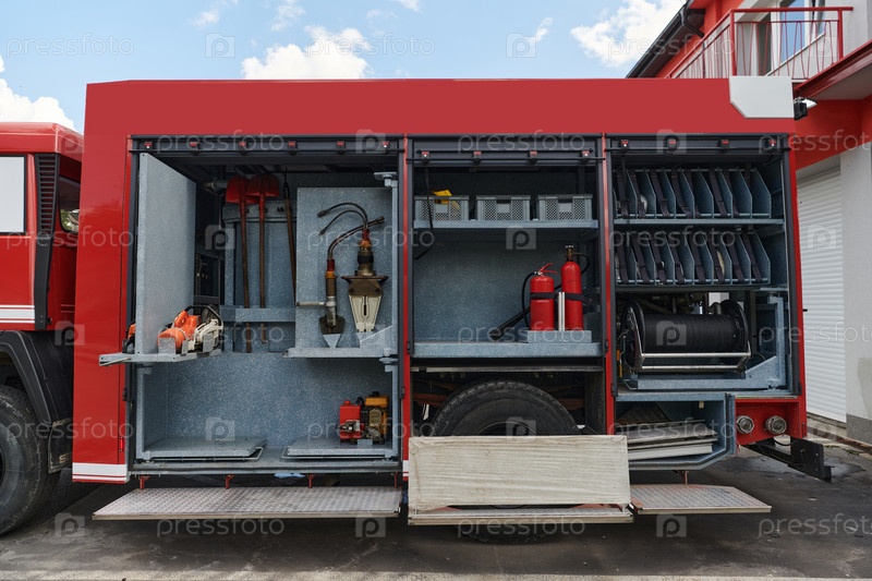Крупный план основного противопожарного оборудования на современной пожарной машине, демонстрация инструментов и снаряжения, готовых к экстренному реагированию на опасные пожарные ситуации