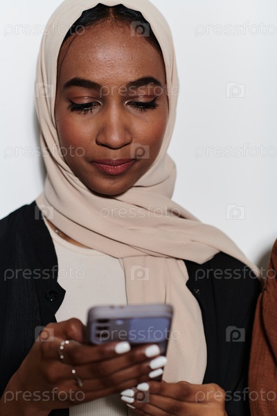 Элегантная арабская женщина, одетая в хиджаб, взаимодействует с современностью, используя смартфон: сопоставление традиционной одежды с современными технологиями, запечатленное в изолированной обстановке на первозданном белом фоне