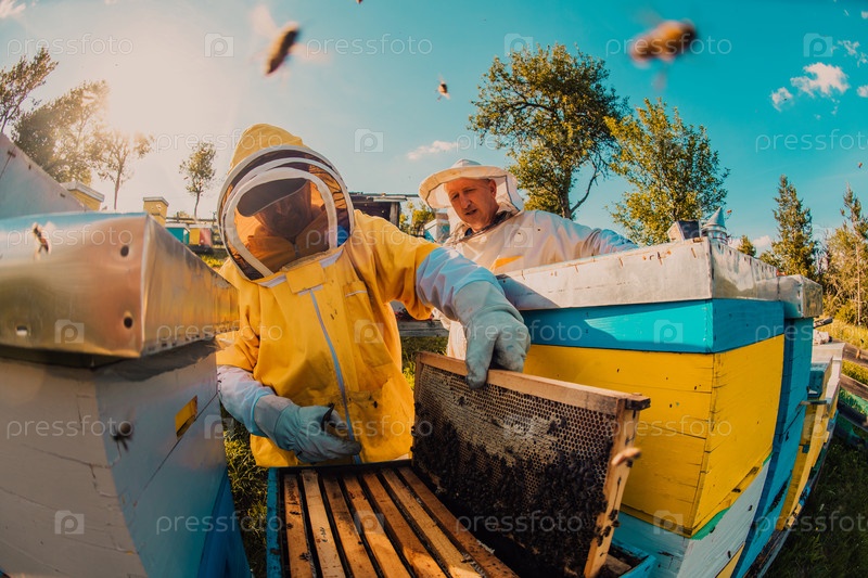 Пчеловоды проверяют мед на рамке улья в поле. Владельцы малого бизнеса на пасеке. Производитель натуральных здоровых продуктов питания работает с пчелами и ульями на пасеке