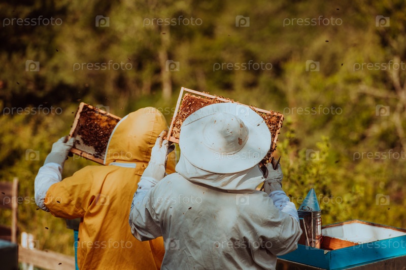 Пчеловоды проверяют мед на рамке улья в поле. Владельцы малого бизнеса на пасеке. Производитель натуральных здоровых продуктов питания работает с пчелами и ульями на пасеке