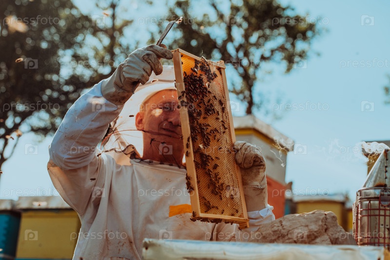 Пчеловод проверяет мед на рамке улья в поле. Пчеловод на пасеке. Пчеловод работает с пчелами и ульями на пасеке