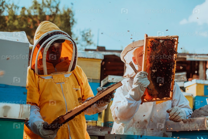 Пчеловоды проверяют мед на рамке улья в поле. Владельцы малого бизнеса на пасеке. Производитель натуральных здоровых продуктов питания работает с пчелами и ульями на пасеке