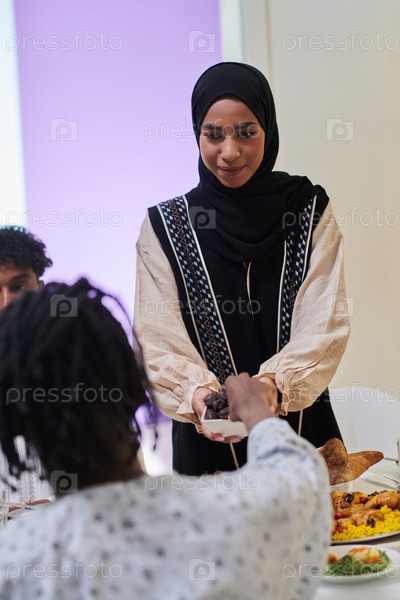 В трогательной сцене священного месяца Рамадан традиционная мусульманка предлагает финики своей семье, собравшейся за столом, демонстрируя дух единства, щедрости и культурного богатства во время этого праздничного и духовного события