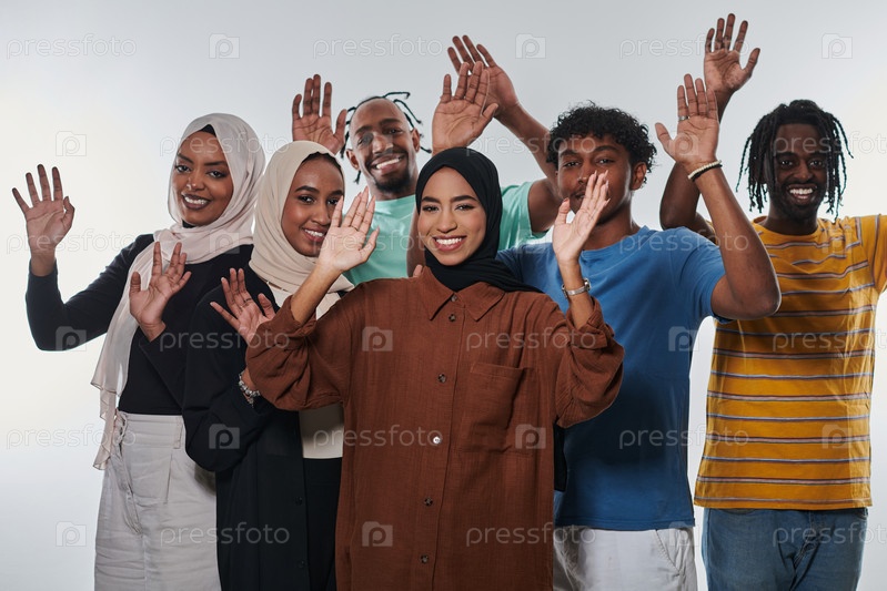 Ликующая и разнообразная группа, в том числе афроамериканец и девушки в хиджабе, энергично машут руками и празднуют, олицетворяя яркость студенческой жизни на белом фоне, символизируя единство, культурное разнообразие и радостный дух общего опыта